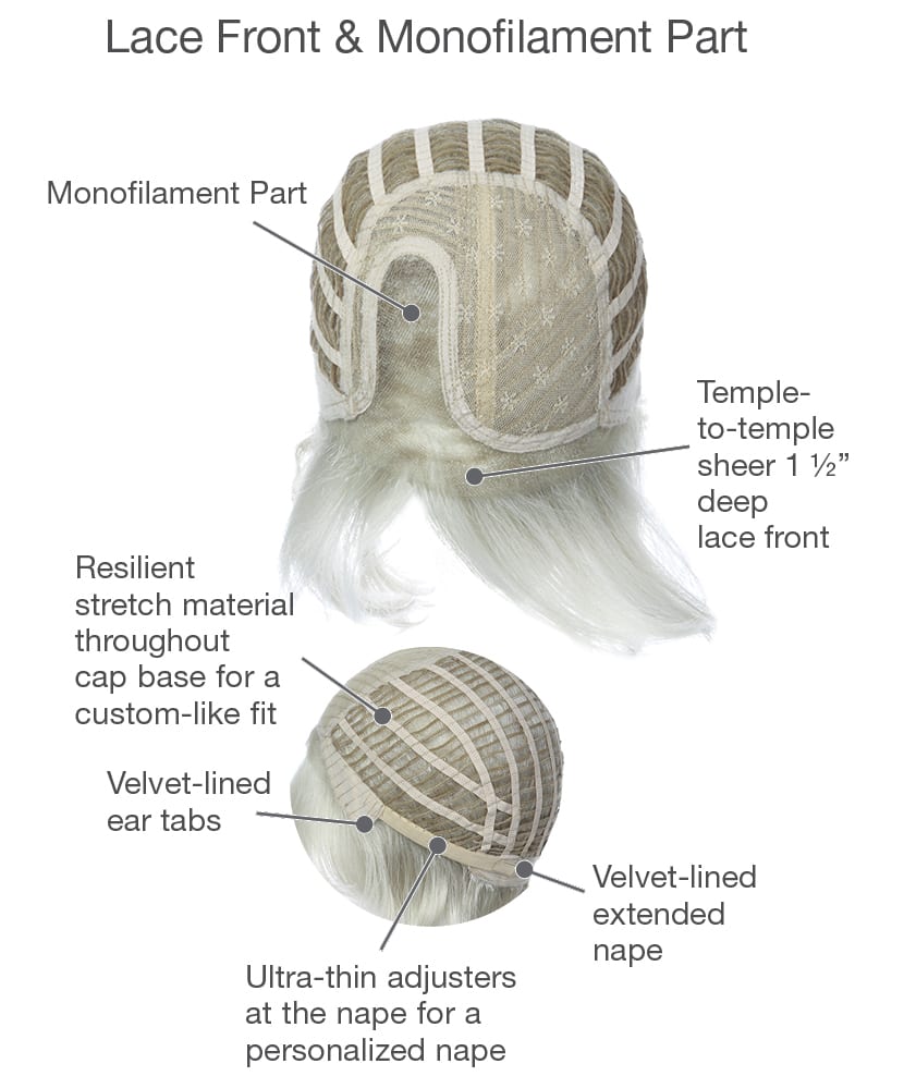 This classic bob is modernized with textured waves. An eyelash bang graces the front to add an air of flirtation, while softly layered lengths throughout offer fullness and movement. The temple-to-temple sheer lace front with a monofilament part allows for off-the-face styling and guarantees a light, comfortable fit and natural look.