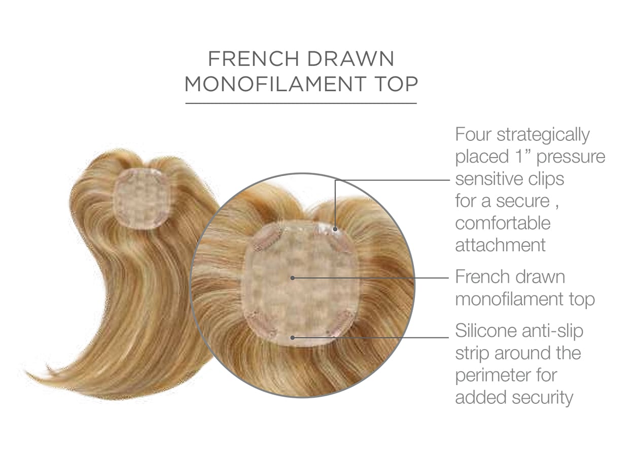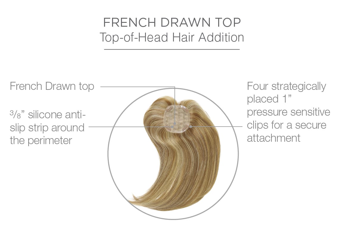 This long, lush top-of-head addition showcases softly tapered layers on a French Drawn monofilament top. It instantly adds extra length, fullness and coverage where needed. 100% Remy Human Hair means that this genius piece can be seamlessly blended with your own hair.