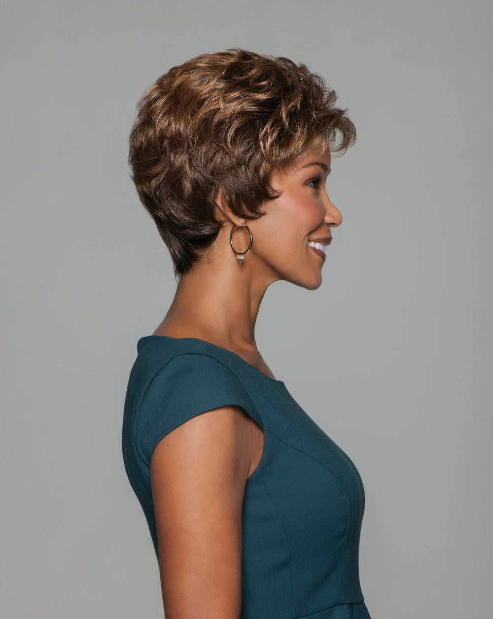 You’ll be all smiles in this sophisticated short ‘do, with all-over layering and soft, subtle curls.